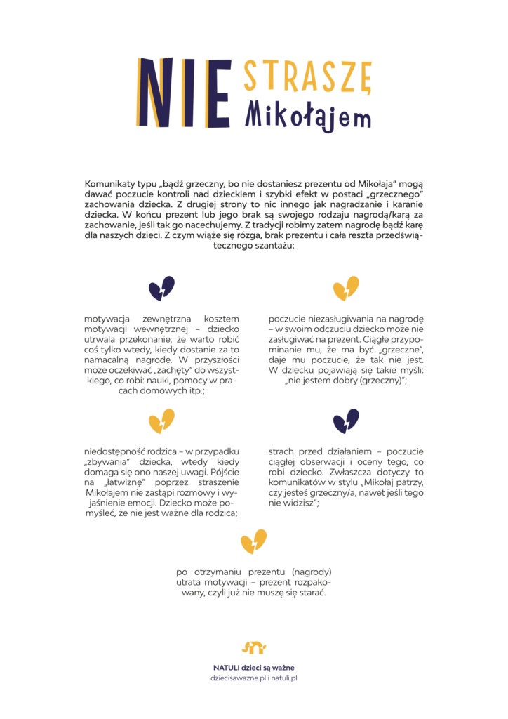 niedostępność rodzica – w przypadku „zbywania” dziecka, wtedy kiedy domaga się ono naszej uwagi. Pójście na „łatwiznę” poprzez straszenie Mikołajem nie zastąpi rozmowy i wyjaśnienie emocji. Dziecko może pomyśleć, że nie jest ważne dla rodzica.